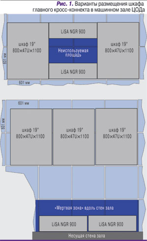 Таким образом, малая глубина шкафа с главным кросс-коннектом допускает несколько вариантов его размещения в зале (рис. 1).