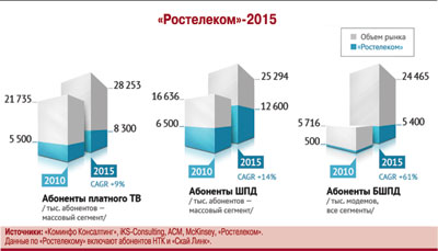 К 2015 г. объединенный «Ростелеком» запланировал получить половину рынка широкополосного доступа в Интернет, 30% – платного телевидения, 22% – от «пирога» беспроводного ШПД. Такие цифры (см. рисунок) фигурируют в формирующейся стратегии развития ОАО «Ростелеком».