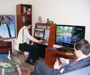 Итак, что же, по мнению оператора, сейчас и в самое ближайшее время будет нужно среднестатистическому домашнему абоненту для полного телеком-счастья? Видео по запросу в формате HD, доступ в Интернет со скоростью 10 Мбит/с, голосовая и видеосвязь, телеметрия и охранное видеонаблюдение. А для этого на одно домохозяйство нужна полоса порядка 50 Мбит/с. Как можно было увидеть на стенде МГТС, все это дает проект «PON в дом». Для получения всех перечисленных услуг у абонента устанавливается комплект оборудования, в который входят оптический модем с четырьмя портами Ethernet для компьютеров и ТВ-приставок, двумя разъемами RJ-11 для подключения телефонов, антенным RF-выходом и модулем Wi-Fi, а также ИБП, который обеспечит работу телефона при перебоях электропитания.