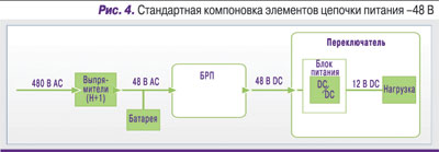Эти элементы соединены с медными шинами и проводами большого сечения, которые связывают различные участки предприятия для распределения питания –48 В на конечную нагрузку. Блоки питания понижают напряжение до 12 В DC и ниже для питания внутренних компонентов (рис. 4).