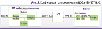 В принципе схему распределения переменного тока можно упростить, устранив понижение в устройстве распределения и подавая ток более высокого напряжения (скажем, 277 В) с ИБП непосредственно на ИT-оборудование (рис. 3). Однако этот подход в настоящее время по ряду причин не используется.