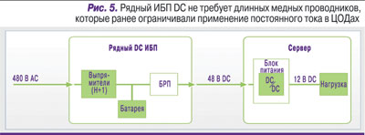 Но в ЦОДах, в отличие от АТС, отсутствуют мощные медные шины для распределения питания DC на стойки. К счастью, новая рядная топология ЦОДов не требует использования таких медных шин (рис. 5). В этой рядной конфигурации ток преобразуется из переменного в постоянный рядом с конечной нагрузкой, что снижает требования к сечению проводника из-за его малой длины.