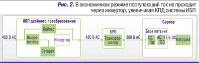 Когда ИБП переменного тока работает в экономичном режиме (рис. 2), его КПД повышается за счет шунтирования преобразования в инверторе. Однако это снижает надежность системы, так как критически важные нагрузки не будут изолированы от общей сети питания и колебаний напряжения, обычно сглаживаемых с помощью инвертора, а для обеспечения надежного перехода на последний требуются сложные цепи синхронизации. К тому же необходимо обеспечить быстрое включение инвертора в случае отключения питания и изолирование сети электропитания для предотвращения возникновения обратного тока в системе распределения. Независимо от скорости и надежности такого переключения риск его отказа в критический момент все равно существует.