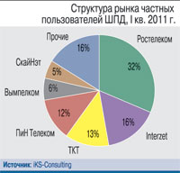Интеграционные процессы идут и в сегменте ШПД для частных пользователей. Несколько среднего масштаба домовых сетей, объединившись, превратились в одного из крупных местных провайдеров «ПиН Телеком» с рыночной долей 12% (больше, чем занимает в Москве его аналог NetByNet). Из домовых сетей крупнее здесь лишь тоже чисто местный Interzet, а вот хорошо стартовавший в свое время «Вымпелком» сейчас лишь замыкает первую пятерку.