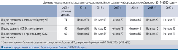Информационное общество у нас строят уже давно и с большим увлечением, больше концентрируясь на процессе, а не на результате. В программе «Информационное общество (2011–2020 годы)» прямо указано на то, что Россия в определении своего уровня развития будет использовать международные рейтинги, основанные на индексах готовности к сетевому обществу (NRI, определяется Всемирным экономическим форумом), развития информационно-коммуникационных технологий (IDI, определяется Международным союзом электросвязи) и готовности к электронному правительству (eGov, определяется ООН). В качестве базовых значений взяты показатели 2008 г., в принципе вполне реалистичные. Однако фигурирующие в программе темпы, с которыми мы, как предполагается, ринемся в информационное общество (см. таблицу), несколько удивляют.