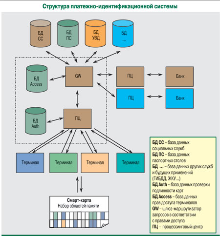 Основное достоинство системы – ее расширяемость. В ней выделены два свободно расширяемых направления – платежное и информационное (на рисунке информационные БД расположены вверху, а платежные – справа от центра). И архитектура системы, и структура самой карточки позволяют гибко, по мере готовности подключать информационные системы учреждений и банков, пожелавших присоединиться к единому информационному пространству. Тем самым обеспечивается возможность поэтапного внедрения проекта и, что немаловажно, долговечность системы, а именно возможность подключения к ней в будущем таких приложений, о которых сейчас мы даже не догадываемся. Это касается в первую очередь информационного направления.