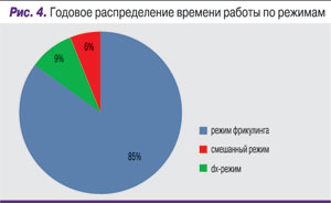 По сравнению с dx-решением годовая экономия энергопотребления микроклиматической системы на основе фрикулинга составит примерно 72%, а применение смешанного режима позволит дополнительно сэкономить еще 3% (рис. 2). Для рассматриваемых условий львиную долю времени система работала в режиме фрикулинга (рис. 4).