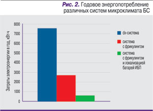 Для расчета экономии электроэнергии, достигаемой в предложенном варианте, использовались данные по энергопотреблению термобатарей в зависимости от перепада температур внутри и снаружи корпуса для батарей ИБП. Для рассматриваемой базовой станции годовая сумма электроэнергии, потребленной системой микроклимата с фрикулингом и локализацией батарей ИБП оказалась в 15 раз (!) меньше, чем для dx-решения (см. рис. 1). Таким образом, наиболее экономично в плане потребления электроэнергии охлаждение с помощью наружного воздуха при локализованных зонах для батарей ИБП.
