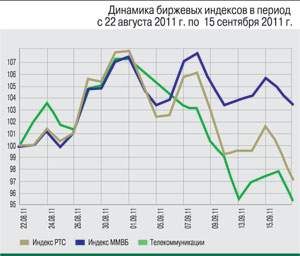 С п р а в к а И К С За период с 15 августа по 15 сентября индекс ММВБ прибавил 3,71% – до уровня 1525,28 пункта, индекс РТС вырос на 0,54%, до 1603,39 пункта. Отраслевой индекс «ММВБ телекоммуникации» за рассматриваемый период показал прирост 3% – до 2224,59 пункта. |