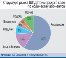 Высокий уровень конкуренции на рынке интернет-доступа Владивостока обусловил быстрый рост абонентской базы. На конец июня 2011 г. в столице края насчитывалось порядка 142 тыс. интернет-пользователей (проникновение – 62%). В Приморье в целом проникновение ШПД достигло 39%.