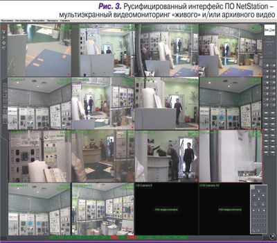 Одна из ключевых возможностей NetStation – удаленное видеонаблюдение и синхронизированное аудиопрослушивание в режиме реального времени. Одновременно с записью видео- и аудиопотоков от камер это ПО обеспечивает возможность вывода на монитор изображения по всем каналам (рис. 3), причем предусмотрено подключение до восьми мониторов на одно АРМ оператора IP-видеосистемы.