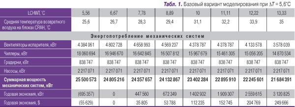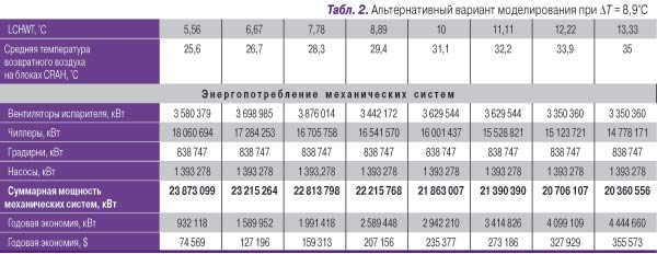 Было проведено компьютерное моделирование с двумя значениями параметра ∆Т, что позволило получить данные для достаточно точной интерполяции в пределах диапазона изменения LCHWT. В базовом варианте (табл. 1) моделирование проводилось для значения ∆Т = 5,6°С. В альтернативном варианте было взято значение ∆Т = 8,9°С (табл. 2). В обоих случаях параметр ∆Т для воды на стороне конденсатора был принят равным 6,7°С, при этом температура воды на выходе конденсатора была равна 29,4°С. Стоимость электроэнергии принята равной $0,08 за 1 кВт (т.е. цене, по которой электроэнергия отпускается на коммунальные нужды).