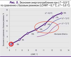 Большинство существующих чиллерных установок рассчитаны на работу в режиме, который можно назвать базовым: LCHWT = 6,7–7,2°С, ∆T = 5,6°С. Поэтому у пользователей может появиться естественное желание посмотреть, какую экономию электроэнергии можно получить, если при любом допустимом значении LCHWT перейти на ∆T = 8,9°С. Экономия может составить от 6 до 18% (рис. 5). Зону, где LCHWT находится в диапазоне 10–12,8°С, а экономия электроэнергии – 10–14%, назовем «выгодной областью». Такой термин используется потому, что переход на соответствующий температурный режим по LCHWT довольно легко реализовать без отрицательных последствий для качества автоматического регулирования работы чиллера и без существенного ухудшения теплового режима в помещении ЦОДа. Дальнейшее повышение LCHWT от 12,8 до 15,6°С «с хвостиком» обеспечивает еще большую экономию электроэнергии – между 15 и 18%. На практике это достижимо, но только при условии тесного взаимодействия с фирмой – изготовителем чиллера, поскольку необходимо предотвратить риски, связанные с работой в режиме малой разности давления хладагента в конденсаторе и в испарителе.