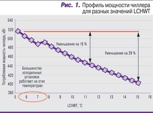 В качестве примера рассмотрим центробежный чиллер производительностью 1000 тонн холода США* (*1 тонна холода США – это количество энергии, которое необходимо отобрать, чтобы 1 т воды при температуре 0°С за 24 ч превратить в лед при температуре 0°С. – прим. ред.) (3513 кВт), у которого параметр LCHWT варьируется в диапазоне от 5,6 до 15,6°С с шагом 0,55°С. Температурный дифференциал испарителя поддерживается постоянным на уровне 7,8°С; аналогично температурный дифференциал конденсатора сохраняется равным 6,7°С при температуре воды 36,1°С на входе и 29,4°С на выходе. Эксперимент с указанным изменением температуры воды на выходе чиллера LCHWT проводился на машине семейства Trane. Полученные результаты вполне предсказуемы. При повышении температуры охлаждающей воды с 5,6 до 15,6°С потребляемая мощность чиллера уменьшилась примерно на 115 кВт, т.е. на 29% (рис. 1). Исходя из того, что большинство холодильных установок работают (при постоянном значении ∆T) на LCHWT в диапазоне 5,6–7,8°С, перевод LCHWT в окрестности 12,8°С позволяет сократить расход электроэнергии на 14–18%. А если пойти на более «агрессивный» вариант и повысить LCHWT до 15,6°С, то можно добиться еще более существенного снижения энергопотребления – до 25–32%. При правильном размещении оборудования по схеме CAC/HAC и хорошем автоматическом регулировании чиллера повышение температуры охлаждающей воды и соответствующее повышение температуры воздуха, подаваемого в ЦОД, не только допустимо, но и дает значительный экономический эффект в виде экономии потребляемой электроэнергии.