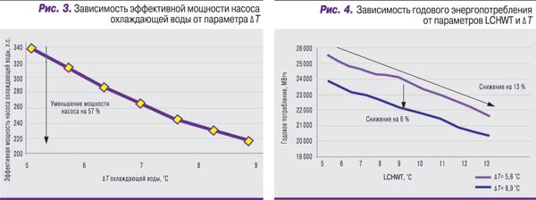 А вот зависимость мощности насоса охлаждающей воды от параметра ∆Т обратная: при повышении ∆Т от 5,6°С до 8,9°С мощность снизилась на 57% (рис. 3). Как будет показано ниже, такое уменьшение мощности значительно снижает энергопотребление объекта в целом.