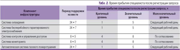 Для каждой инженерной системы в SLA следует указать максимально допустимое время прибытия специалиста для начала работ по устранению инцидента (см., например, табл. 2).