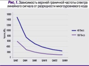 Одиночный 10-гигабитный медножильный трансивер потребляет примерно на 20% меньше мощности по сравнению с оптическим аналогом. При переходе на более высокие скорости мощность растет, но за счет меньшего количества цепей передачи в целом достигается выигрыш. Тем не менее использовать этот выигрыш во всем диапазоне возможных длин горизонтальных кабелей проблематично, поскольку на качественные показатели тракта передачи начинают значимо влиять тепловые (собственные) шумы приемника. Необходимость их учета обусловлена следующими факторами. Во-первых, вынужденное применение относительно узкополосных многопозиционных кодов, вызванное необходимостью согласовать спектр сигнала и полосу пропускания симметричного тракта (рис. 1), независимо от их практической реализации (РАМ и QAM) приводит к уменьшению расстояния между двумя разрешенными уровнями, что эквивалентно падению мощности сигнала. Далее, наращивание скорости неизбежно расширяет спектр линейного сигнала и сопровождается дополнительными потерями за счет увеличения затухания на высокой частоте. Одновременно по тем же причинам приходится расширять полосу приемника, что приводит к пропорциональному росту общей мощности теплового шума.
