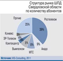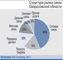 В отличие от большинства субъектов РФ, где половина, а то и более доходов отрасли связи принадлежит сотовым операторам, в Свердловской области совокупные доходы сотовиков в 2011 г. составили лишь 43% телеком-выручки региона, зато доля сегмента передачи данных достигла 16% (в целом по России – 13%).