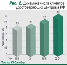 Важное направление развития услуг, связанных с ЭЦП, – активное внедрение технологии среди физических лиц (выдача электронной подписи для работы с порталом госуслуг, а также для совершения банковских операций). Кроме того, в соответствии с новым законом об электронной подписи, принятым в 2011 г., сегодня получить электронную подпись могут не только физические лица, но и юридические. Таким образом, по оценкам iKS-Consulting, число клиентов удостоверяющих центров в РФ вырастет с 2,1 млн в 2011 г. до 2,9 млн в 2013-м.