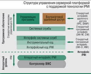 В современных серверных платформах для реализации функций управления широко используется архитектура IPMI (Intelligent Platform Management Interface), разработанная Intel при участии HP, NEC и Dell. Эта архитектура составляет фундамент для управления гетерогенными серверными решениями, конкретные же механизмы управления определяются производителями серверов. Обычно эти механизмы реализуются с помощью управляющего контроллера BMC (Baseboard Management Controller), играющего роль интерфейса между аппаратными средствами сервера и управляющим ПО.