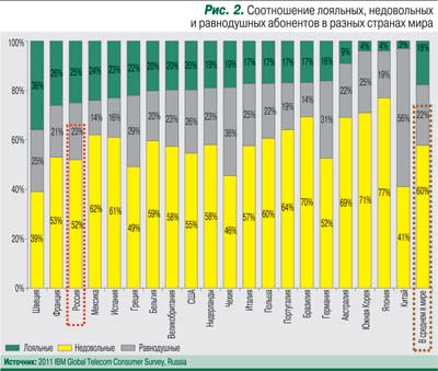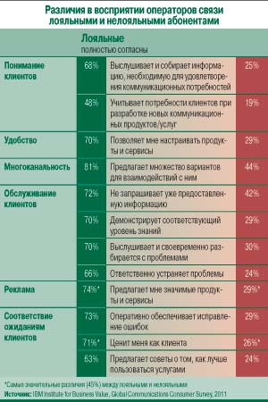 Между тем по данным глобального онлайн-исследования потребителей телекоммуникационных услуг, проведенного в 2011 г. IBM Institute for Business Value в 24 развитых и развивающихся странах и охватившего 13 тыс. человек, средний по миру показатель лояльности клиентов в отрасли ниже, чем, например, в розничной торговле. Лояльными своему оператору оказались только 18% участников опроса, тогда как доля пользователей, негативно настроенных по отношению к своему поставщику услуг связи, достигла почти 60%.