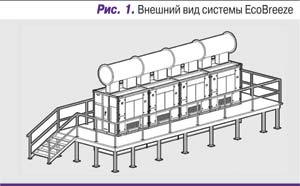 Для масштабируемых ЦОДов компания Schneider Electric (APC) выпускает интересную систему EcoBreeze. Это модульная система охлаждения (рис. 1), основанная на использовании теплообменника воздух–воздух и косвенного испарения воды. EcoBreeze обладает способностью переключаться между режимами охлаждения с помощью теплообменника воздух–воздух и режимом с использованием косвенного испарения, чтобы с наибольшей эффективностью обеспечить ЦОД холодом. Конструкция EcoBreeze позволяет снизить потребление энергии за счет использования разницы температур между внешним окружающим воздухом и воздухом, возвращаемым от ИТ-оборудования (фрикулинг).