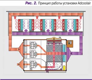 Интересное техническое решение для модульных ЦОДов разработано компанией Menerga – ее недавно представленная модель охлаждающего устройства под названием Adcoolair предназначена специально для дата-центров. Принцип работы этой системы (рис. 2) во многом схож с принципом работы EcoBreeze. Удаление тепла из помещений с высокой тепловой нагрузкой обеспечивается применением свободного охлаждения (фрикулинга) и работой интегрированной в установку холодильной машины с непосредственным испарением фреона, а также адиабатическим охлаждением за счет испарения воды.