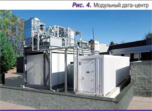 Среди систем охлаждения модульных ЦОДов присутствуют и чиллерные системы. Чиллеры могут как монтироваться на общей с контейнером раме, так и устанавливаться на площадке в виде отдельного блока. В качестве внутренних блоков могут служить межстоечные внутрирядные кондиционеры, работающие на холодоносителе, и специальные теплообменные аппараты, размещенные на крыше контейнера. Кроме того, в модулях используют стойки с жидкостным охлаждением. Типичным примером такого решения служит модульный дата-центр компании Cisco (рис. 4).