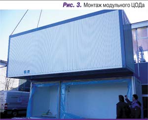 Выше мы вели речь о модульности систем охлаждения достаточно крупных стационарных дата-центров. Но реалии нашего времени таковы, что в мире все чаще развертывают дата-центры с действительно модульным принципом строительства. Такой принцип подразумевает, что ЦОД можно построить из различных модулей-кубиков: модуль серверного помещения, модуль системы охлаждения, модуль ИБП и электропитания, модуль дизель-генератора и т. п. Развертывание модульного ЦОДа (рис. 3) начинается с размещения на площадке минимально необходимого количества технологических и инженерных модулей, обеспечивающих первоначальные запросы заказчика. Дальнейшее развитие идет за счет добавления дополнительных модулей.