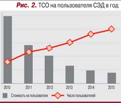 С точки зрения контроля эффективности также важно сокращение стоимости владения системой ECM. Мы используем показатель TCO на одного пользователя в год (рис. 2).