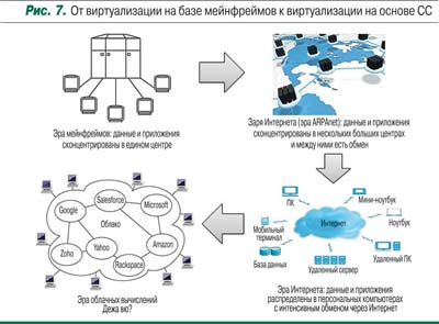 С развитием приложений, взрывным ростом видеоуслуг, которые, как известно, требуют больших объемов данных, вновь возникла нужда в централизованном хранении и обработке информации. Так концепция виртуализации обрела второе рождение и стала своеобразным дежа вю стиля работы компьютерных пользователей в эру мейнфреймов (рис. 7).