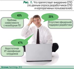 Об интересе к СПО свидетельствует и внимание к Linux со стороны крупных российских разработчиков проприетарных продуктов. Фирма «1С», пять лет назад не рассматривавшая Linux-рынок всерьез, объявила о полной поддержке этой ОС в «1С:Предприятие 8.3». Совместимостью со свободной ОС достаточно давно озаботилась компания «Гарант», последние несколько лет регулярно проводящая тестирование своей системы в среде Linux на основе Wine.