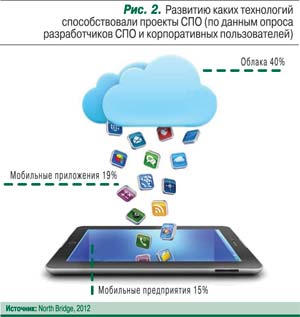 Между тем часто забывают, что в основе многих проектов, «выстреливших» в последние годы, лежит открытый код, и влияние open source на развитие «трендовых» технологий весьма велико. Разработчики СПО, в свою очередь, одними из первых улавливают тенденции и предлагают миру весьма интересные проекты в сферах SaaS, облачных вычислений, мобильных технологий и т.п. (рис. 2).