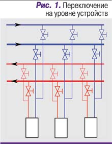 Для решения задачи применяют три схемы. Первая – переключение на уровне устройств (рис. 1). Ее недостатки – требования по согласованному переключению и потенциальная множественность точек отказа. Кроме того, если это внешний контур, то, согласно требованиям по незамерзанию, придется либо регулярно выполнять переключение, либо предусматривать какой-либо иной способ подогрева не работающих в данный момент труб.