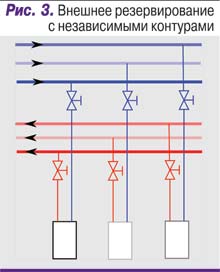 Третья схема – внешнее резервирование, с несколькими независимыми контурами (рис. 3). Эту схему, по мнению автора, можно рекомендовать в большинстве случаев – но при этом она, к сожалению, реже всего используется. Дополнительные краны в ней не нужны вообще, и логика работы системы проста и прозрачна. Ее недостаток – необходимость устраивать не менее трех независимых систем, хотя и относительно маломощных. Обычно вызывает трудность и прокладка труб, занимающих много места.