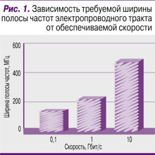 Внедрение схем параллельной передачи – далеко не единственный прием для более полного использования потенциальной пропускной способности кабелей связи. Достаточно эффективны и применение многоуровневых линейных сигналов, и переход на менее требовательные к ширине полосы канала блочные коды, и введение процедур упреждающей коррекции ошибок, и другие меры. Однако даже их совместное действие лишь замедляет рост тактовой частоты линейного сигнала, но не в состоянии остановить его полностью. В частности, увеличение быстродействия канала на основе симметричных кабелей на два порядка потребовало пятикратного повышения верхней граничной частоты канала связи (рис. 1, для скорости 1 Гбит/с рассматривается техника категории 6).
