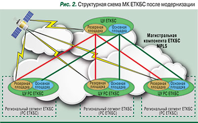 В 2009–2011 гг. в Москве и 78 территориальных учреждениях Банка России на основе технологии MPLS была создана новая магистральная компонента ЕТКБС, лишенная недостатков сетей FR/ISDN. За счет организации в регионах резервных площадок была также повышена отказоустойчивость (рис. 2).