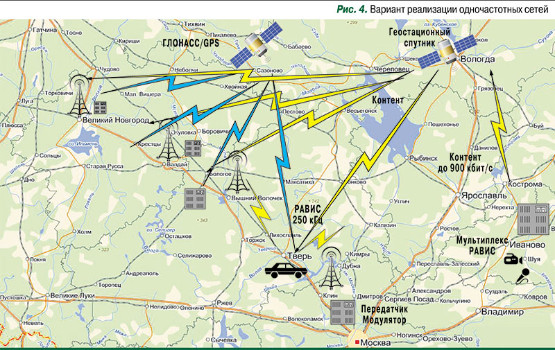 создание одночастотных сетей вещания для мобильного приема вдоль шоссейных и железнодорожных путей сообщения с синхронизацией передатчиков по сигналам ГЛОНАСС/GPS и передачей контента по оптоволоконным каналам или через геостационарный спутник (рис. 4);