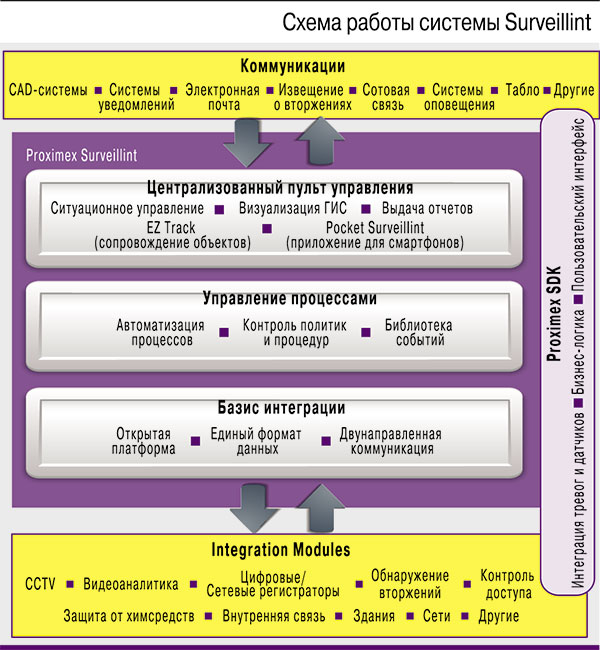 Surveillint представляет собой открытую, масштабируемую платформу, рассчитанную на тысячи датчиков, с автоматическим обнаружением новых устройств в системе. Наличие Proximex SDK позволяет интегрировать в систему дополнительные подсистемы и устройства, как вновь приобретенные, так и уже функционирующие на объекте заказчика.