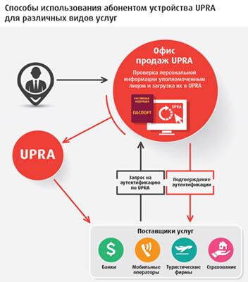 Поэтому с вводом в действие UPRA и провайдеров услуг (банки, мобильные операторы, ритейл) снимается необходимость выстраивать собственную систему идентификации пользователей – у UPRA есть все необходимые технологические и инфраструктурные решения. Являясь единой точкой входа с данными, проверенными лично, UPRA может быть использована, как средство идентификации и для пользования системой государственных электронных услуг. Что обеспечит дополнительный доход сотовым операторам, использующим данную технологию. При этом вся забота об обеспечении совместимости с государственными услугами решается на уровне UPRA, а не провайдерами.