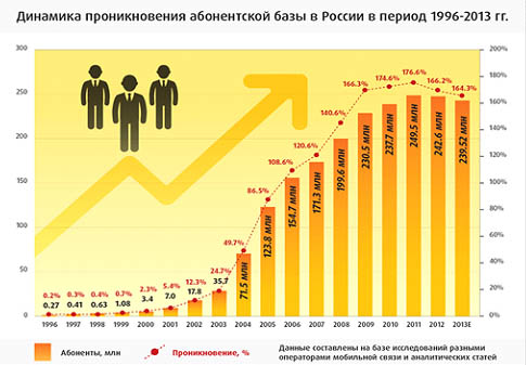 В России, вслед за странами Европы, прекратился рост абонентской базы операторов (количество сотовых абонентов, активных SIM-карт). Во втором квартале 2013 г. их количество составило 234,11 миллиона единиц, то есть