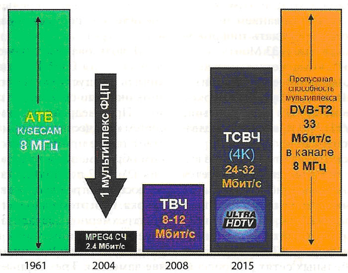 Сегодня в нашей стране полным ходом осуществляется переход на цифровое эфирное вещание, пока в режиме передачи программ стандартного качества, хотя телевидение высокой четкости уже стало необходимостью. Ведь трудно себе представить, что социально значимые программы для населения навсегда останутся стандартного качества. Но для перехода к ТВЧ нужны частотные ресурсы. На горизонте маячит телевидение сверхвысокой четкости, а это еще дополнительные ресурсы. Позволю себе привести рисунок из статьи В.В. Бутенко*. |
