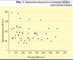 У задействованных в опросе ЦОДов площади и удельные мощности варьировались произвольным образом. При этом 44 из 53 ЦОДов (83%) имели площадь менее 4600 кв. м и удельную мощность ниже 1600 Вт/кв. м. Отметим интересную тенденцию: ЦОДы, спроектированные на более высокую удельную мощность, как правило, имеют меньшую площадь по сравнению с ЦОДами, рассчитанными на меньшую удельную плотность (рис. 1, наиболее отчетливо это видно в верхней части диаграммы).