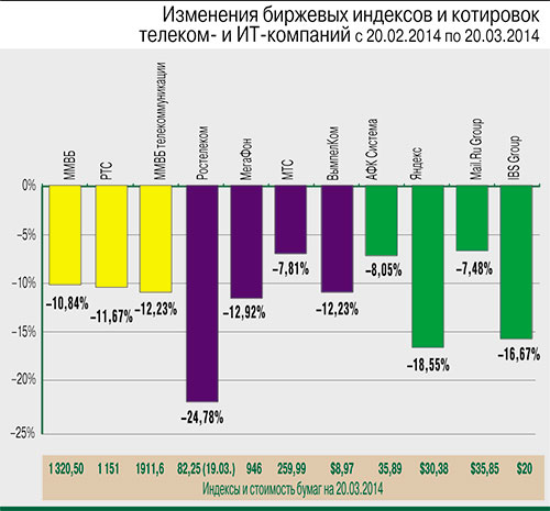 С 20 февраля до 20 марта индекс ММВБ снизился на 10,84% (до 1320,5 п.), а индекс РТС – на 11,69% (до 1150,82 п.). Отраслевой индекс «ММВБ–телекоммуникации» потерял 12,23% (до 1911,6 п.).