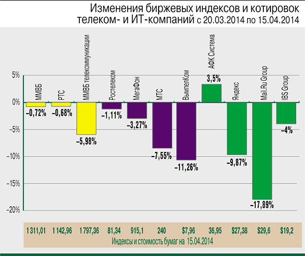 С 20 марта до 15 апреля индекс ММВБ снизился только на 0,68% (до 1311,01 п.), а индекс РТС потерял 0,69% (до 1142,86 п.). Отраслевой индекс «ММВБ телекоммуникации» потерял почти 6% (до 1797,36 п.).