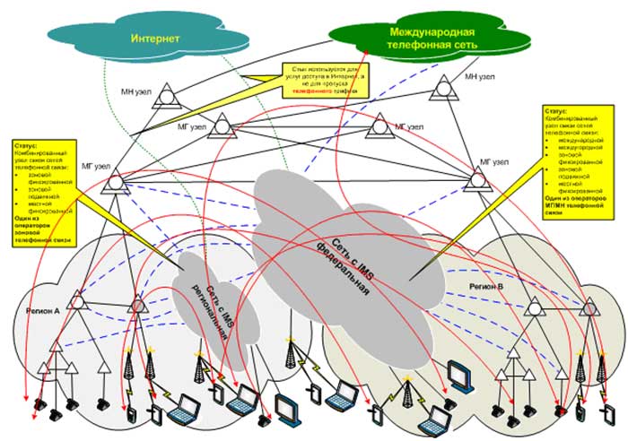 С учетом существующих подходов к лицензированию и классификации телефонных сетей на переходный период предлагается рассматривать два типа сетей IMS - региональные и федеральные. Первые действуют на территории субъекта РФ и оператор такой сети использует лицензии на местную и внутризоновую фиксированную телефонию и (или) на подвижную радиотелефонную связь. Вторые функционируют в пределах всей РФ и оператор использует весь набор лицензий на фиксированную и, возможно, подвижную телефонию, включая междугородную и международную связь (см. рис. 2).