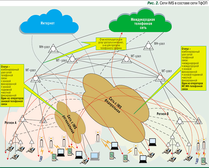 С учетом существующих подходов к лицензированию и классификации телефонных сетей на переходный период предлагается рассматривать два типа сетей IMS – региональные и федеральные. Первые действуют на территории субъекта РФ, и оператор такой сети использует лицензии на местную и внутризоновую фиксированную телефонию и (или) на подвижную радиотелефонную связь. Вторые функционируют в пределах всей страны, и оператор задействует весь набор лицензий на фиксированную и, возможно, подвижную телефонию, включая междугородную и международную связь (рис. 2).
