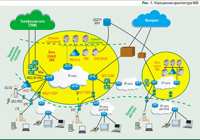 Вместо привычной телефонной иерархии, построенной на принципах агрегации трафика (местная сеть – зоновая сеть – междугородная сеть – международная сеть), в современных сетях принята совершенно другая градация, функциональная: уровень доступа и транспорта – уровень управления сессиями – уровень услуг (приложений). Именно это и закреплено в концепции и архитектуре IMS (рис. 1). При этом традиционная коммутация реализуется на двух уровнях – доступа/транспорта и управления сессиями.