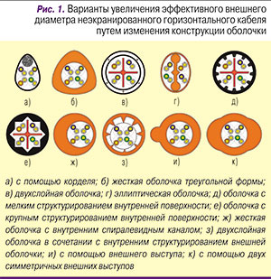 Известно, что горизонтальные кабели со структурой U/UTP очень просты в инсталляции. Однако они неустойчивы к межкабельным переходным влияниям, что особенно сильно сказывается при создании систем передачи со скоростью 10 Гбит/c. Стремление решить эту проблему вызывало появление большого количества разработок, магистральным направлением которых стало увеличение эффективного внешнего диаметра готового изделия за счет изменения дизайна внешней оболочки.
