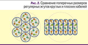 Однако в настоящее время наблюдается ренессанс плоских конструкций применительно к гибким кабелям для коммутационных шнуров. Обращение к ним дает ряд преимуществ. Во-первых, подобные шнуры намного лучше, чем круглые, подходят для прокладки под коврами и в различных полостях элементов оформления интерьеров помещений и мебельной фурнитуры. Во-вторых, из таких кабелей заметно проще сформировать регулярную структуру. В сочетании с меньшей площадью поперечного сечения одиночного провода из-за большей плотности конструкции последнее заметно уменьшает размеры жгута, что так важно в ЦОДах для обеспечения эффективности функционирования системы воздушного охлаждения.
